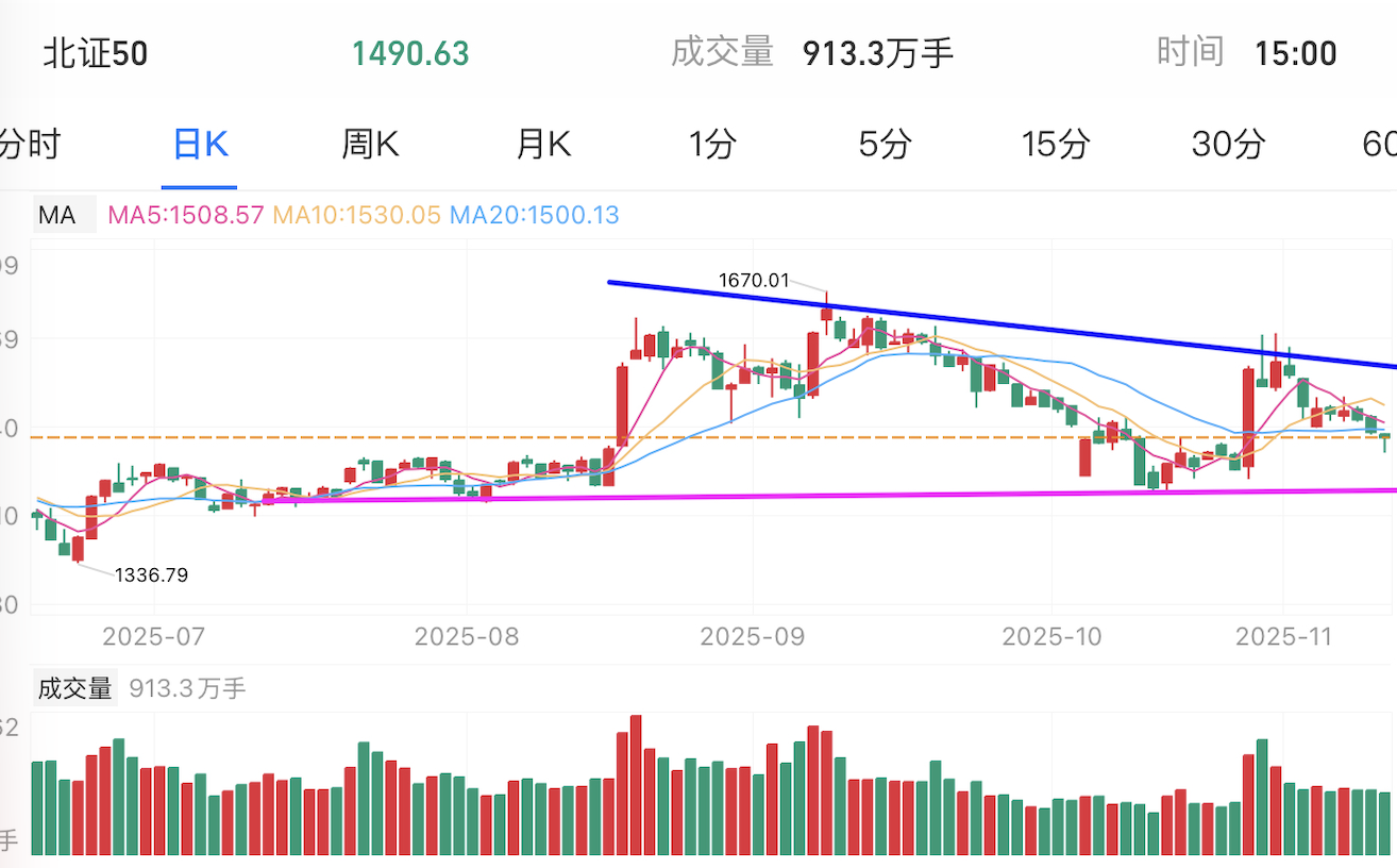北证50 近期一直处于盘整期,最近在前低支撑位突然放量大涨,然而没能持续涨势,很快回落,周三跌破短期上升趋势,趋势已经下行,距离前低支撑位还有下行空间。