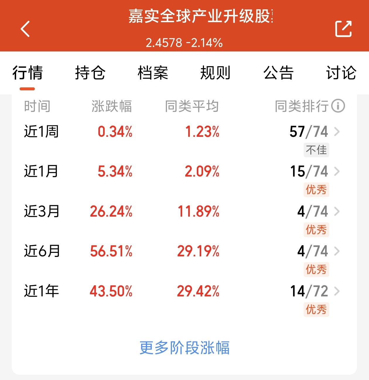 最近的行情回落,也是逢跌布局的机会,投资性价比高。$嘉实全球产业升级股票发起式(QDII)C$ 近一个月上涨了5.34%,近六个月的收益率高达56.51%.盈利能力强。端侧 Al多模态交互普及,技术使用门槛降低,加速各行业渗透,拓宽基金增长空间。