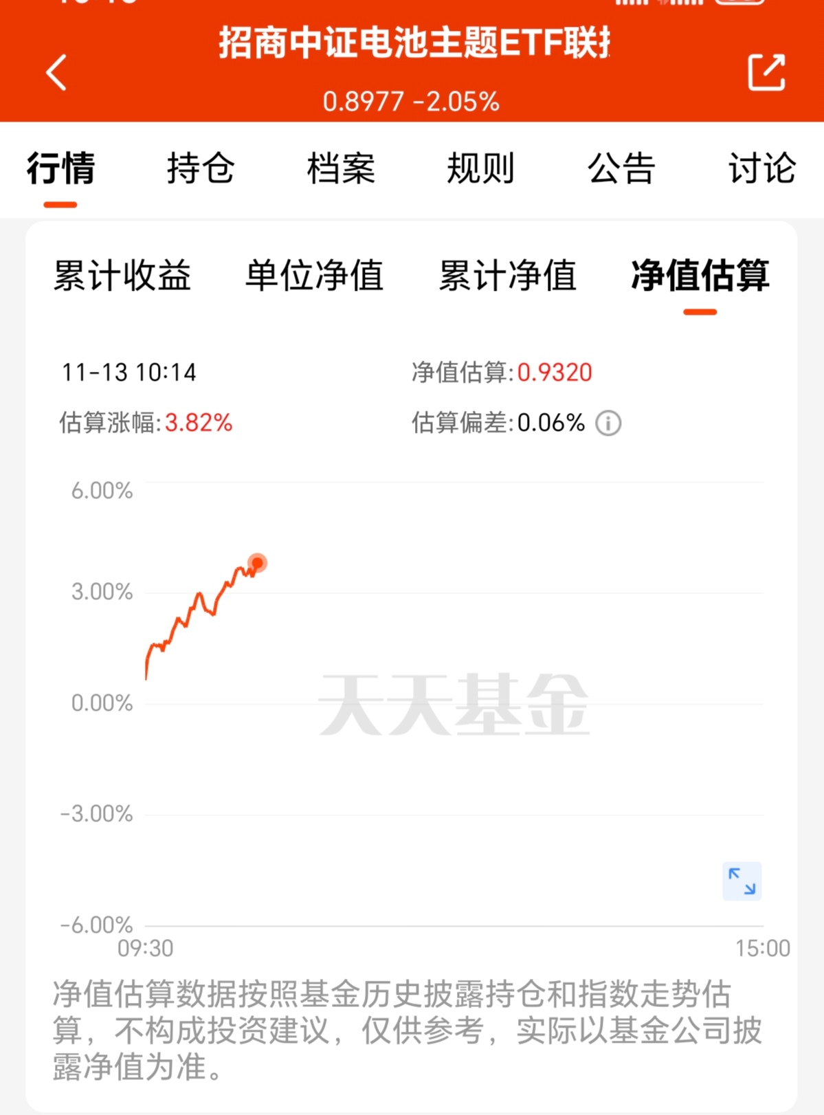 今日A股市场迎来低开高走趋势,个股当前也是涨多跌少,尤其是火热的电池赛道,更是迎来大涨节奏,其中$招商中证电池主题ETF联接C(OTCFUND|016020)$持仓聚焦电池全产业链,目前实时估值涨幅高达3.82%,看其趋势仍在上涨,而从中长期逻辑来看,锂电板块当前估值并未高估,预计明年电池行业将会保持20~30%的稳定增长,从而进一步打开向上空间!
