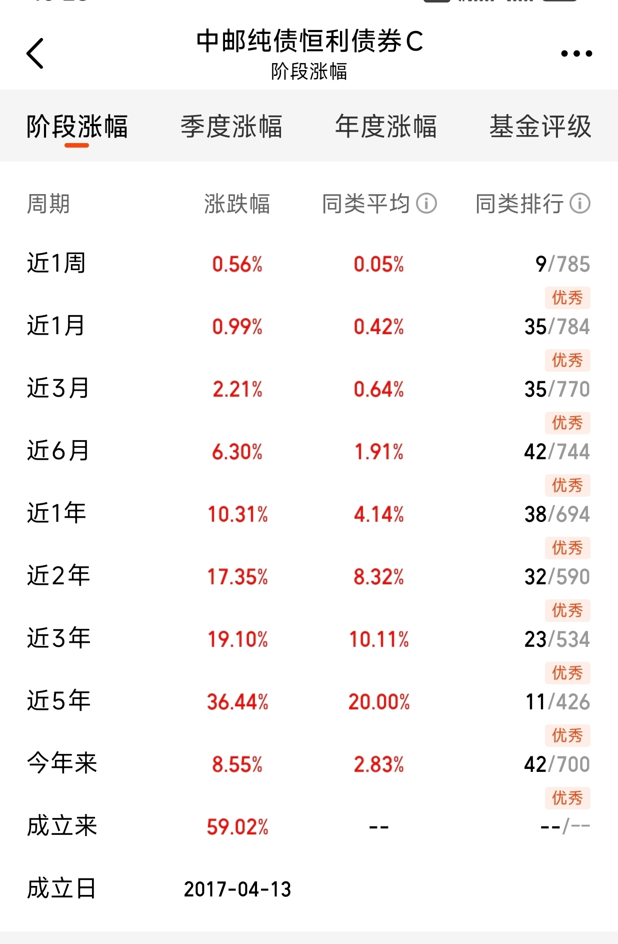 近一周业绩亮眼的就是这个$中邮纯债恒利债券C$,收获不错,近一周56个蛋