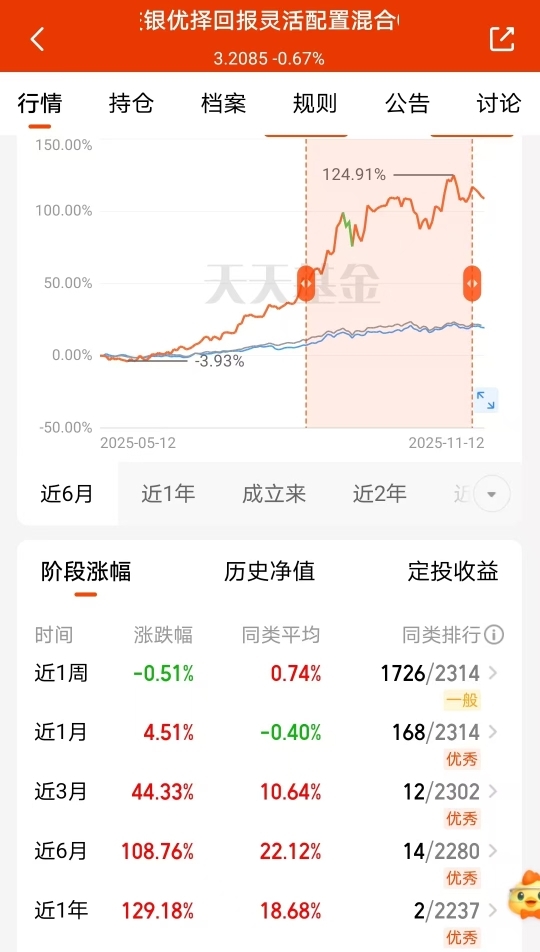 这基金近一年涨129%+真能打!近半年都翻倍了,比大盘强了快五倍。今天小跌0.6