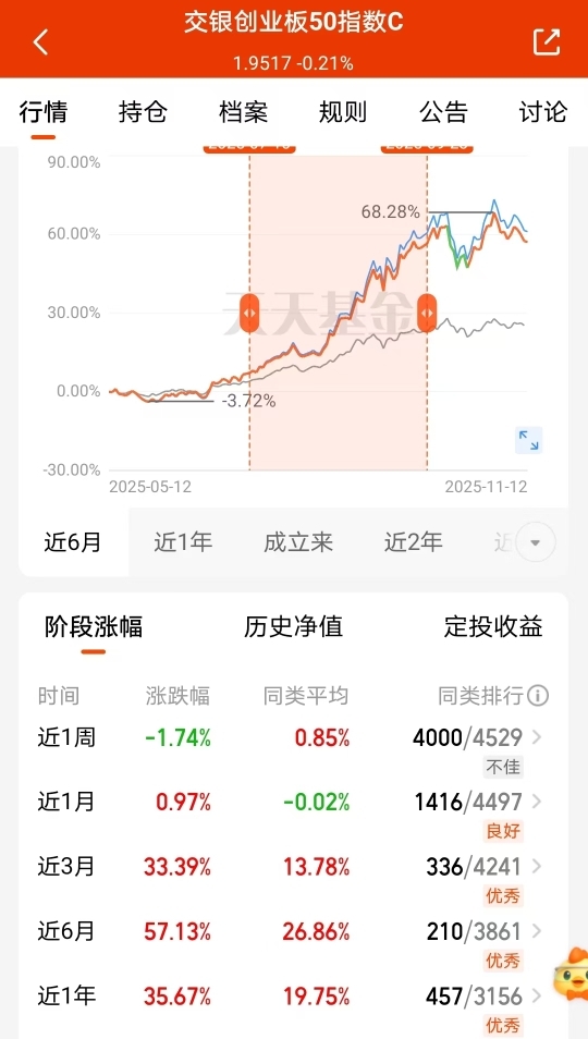这基金近一年35.67%的收益挺稳的,基本贴着创业板50指数走,比同类平均强出一