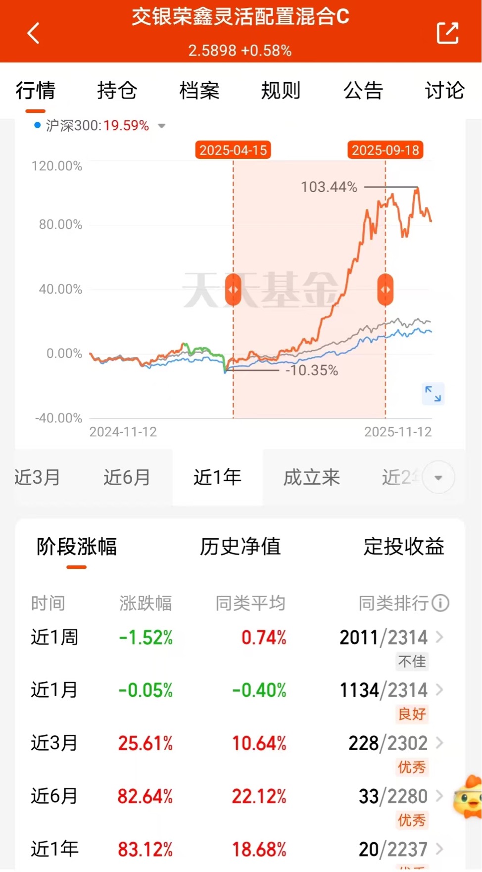 交银荣鑫C近一年83.12%的涨幅太猛了!近6月也涨了82.64%,沪深300根本追不上。今天还涨了0.58%,走势很稳。它走的是灵活配置路线,踩中了现在的核心赛道,行业后续动作不少,这节奏肯定能跟上,后续接着涨没问题。