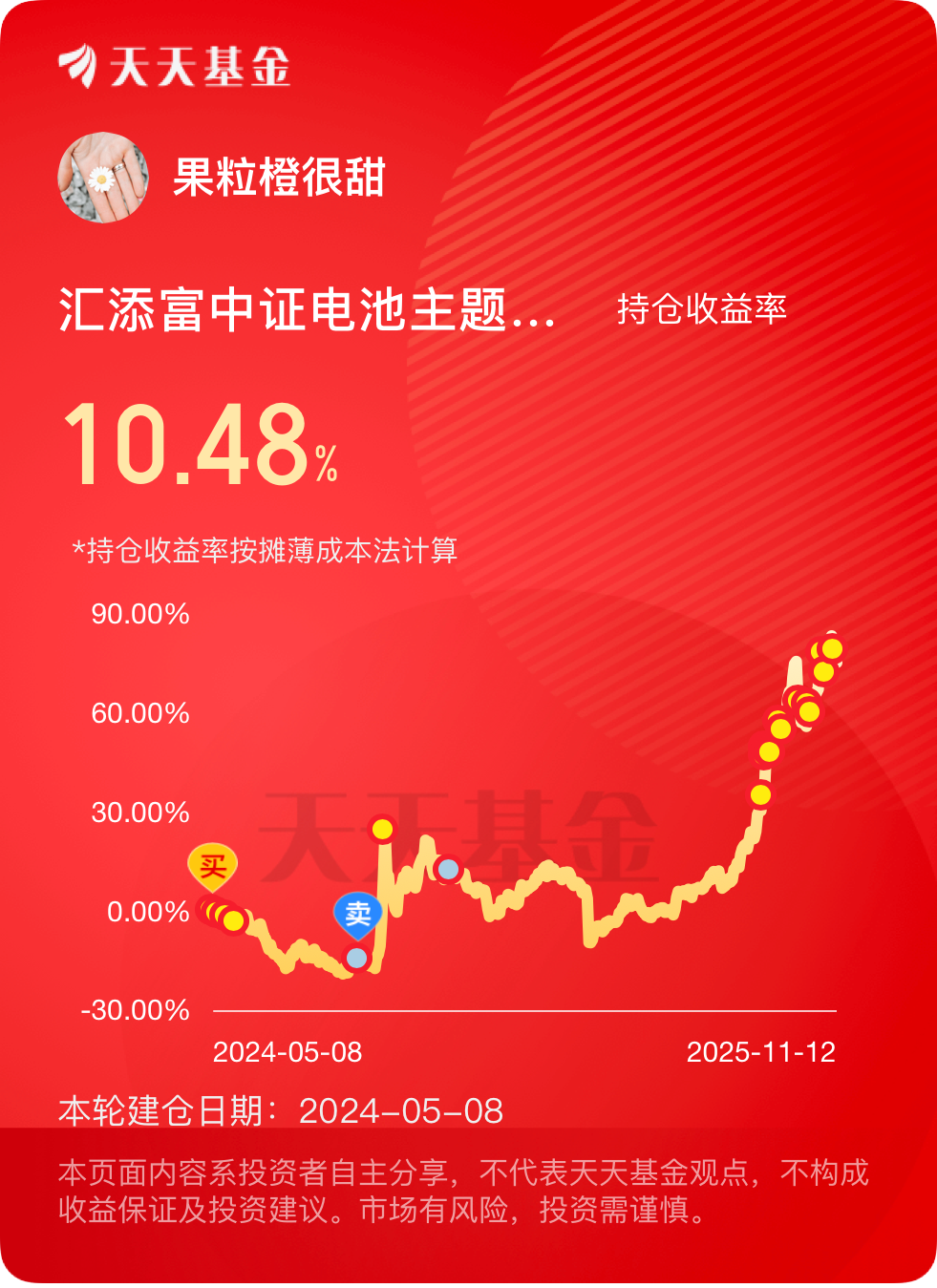 #段永平:投资茅台不需要太看宏观环境# d电池板块今天挺猛的,$汇添富中证电池主题ETF发起式联接C$ 今天估值大涨6个多点,这波反弹力度超预期了,还好前面调整时没卖,反而加了点仓。美滋滋吃肉喽