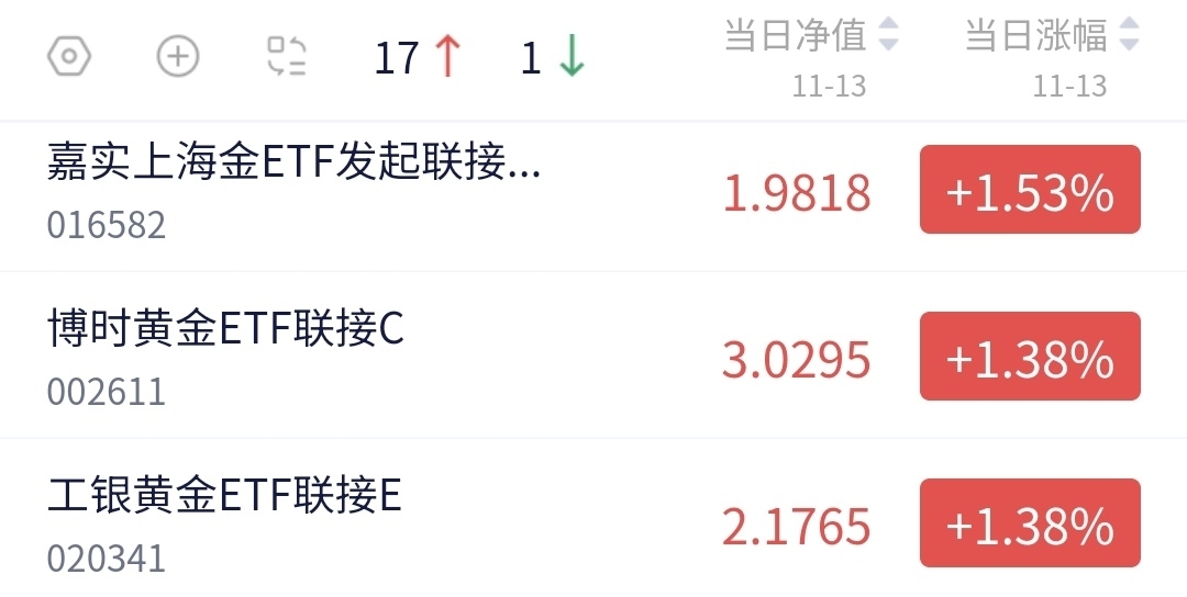 像我的$嘉实上海金ETF发起联接C$ 今日估值1.53%,挺不错的哦,现在讨论区关键还有我的,长期来看近一年上涨50.23%,也不错。黄金长期我很看好,这个我打算持续拿着。
