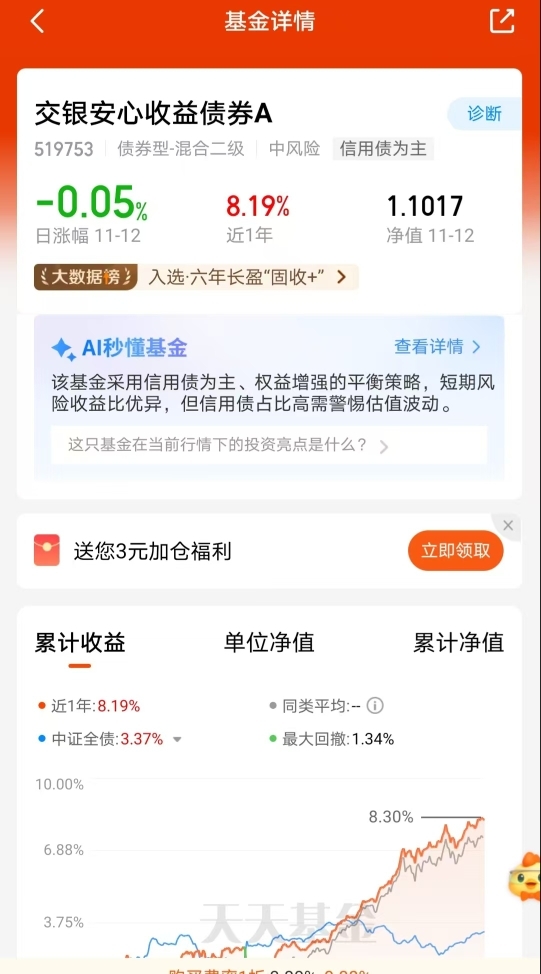 交银安心收益A近1年涨8.19%,比中证全债强不少!它走的是信用债打底+权益增强的“固收+”路子,既稳又有成长空间,最大回撤1.34%很踏实。今天小跌是短期波动,六年长盈的头衔不是白拿的,后续这种稳健增值肯定能持续。