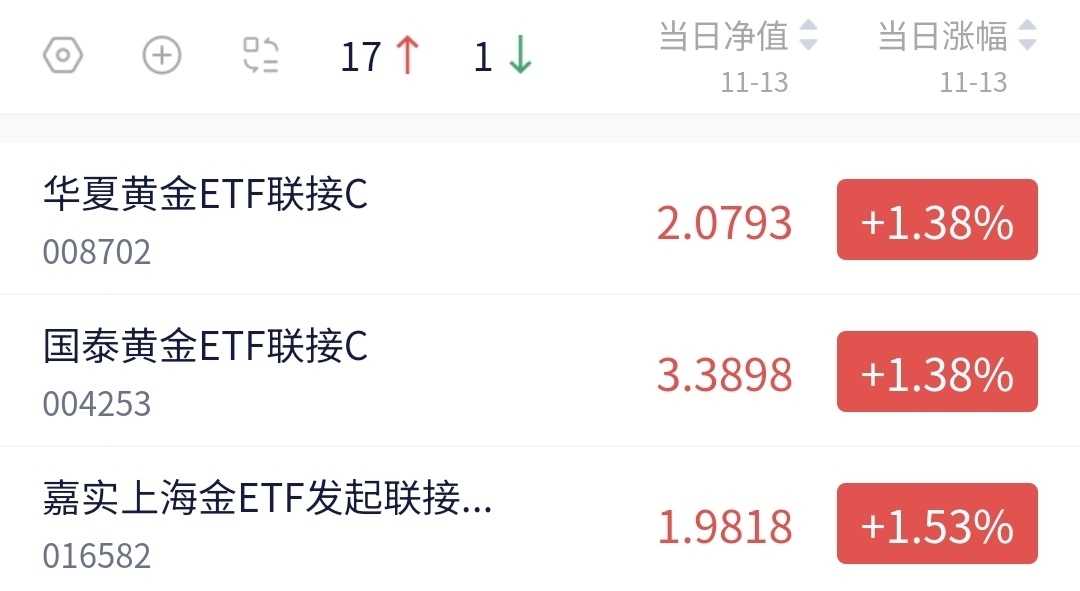 今天权益市场和黄金板块双双发力,涨势都很亮眼!之前我就一直说黄金的长期价值值得期待,这不,现在又回到了位置了。 我的$嘉实上海金ETF发起联接C$ 今日估值涨了1.53%,表现很给力,讨论区里还有我的“”,近一年涨幅超50%!黄金的长期潜力我始终看好,这只基金我打算一直持有长期布局。