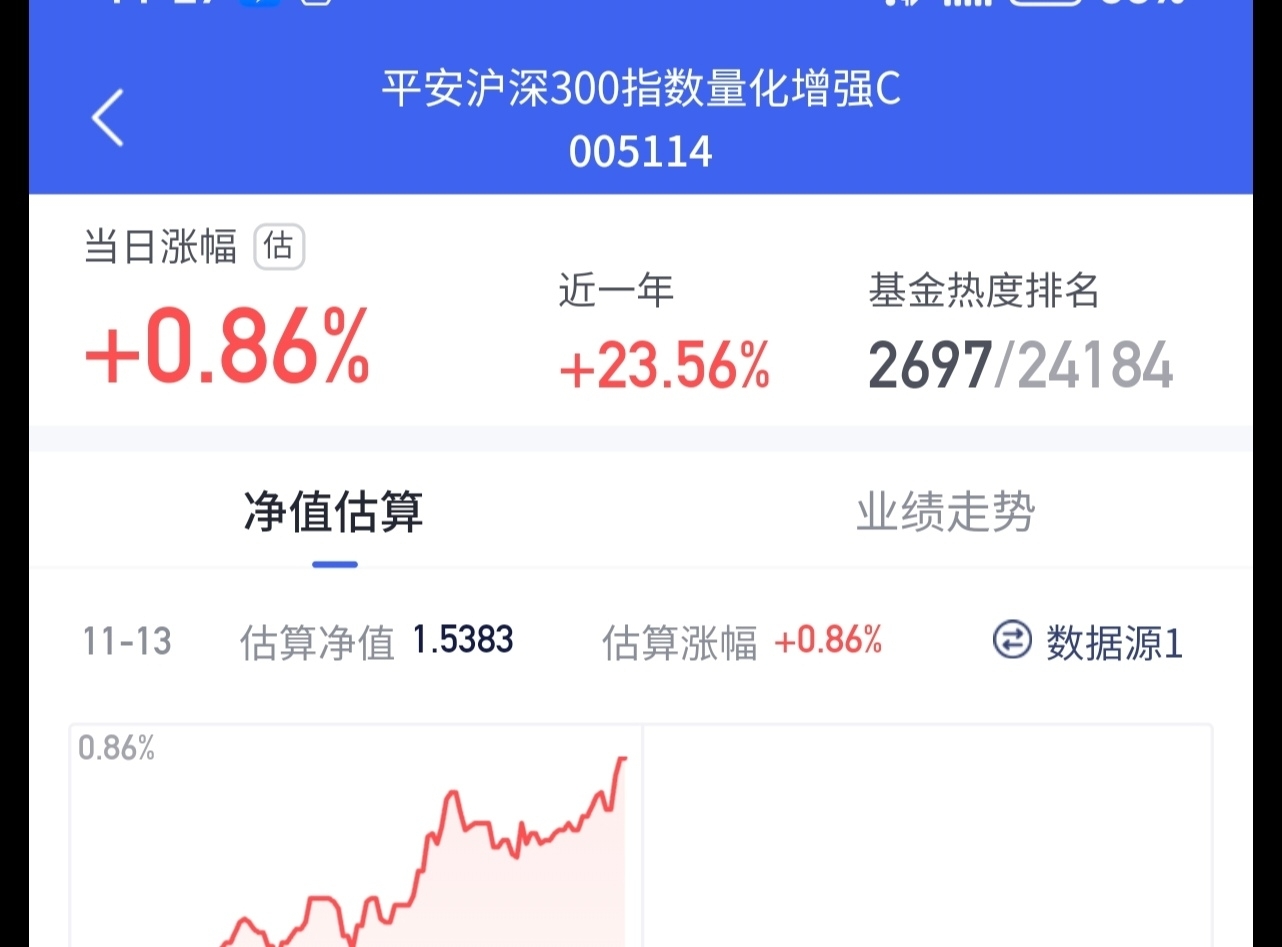 今天大盘表现亮眼,三大 指数集体上涨,创业板领涨,今天的宽}基 指数表现也是不错,我关注的$平安沪深300指数量化增强C$盘中估值上涨0.86%,宽基指数要比单一赛道稳健,波动不大,收益还不错,继续看好它的上涨空间。