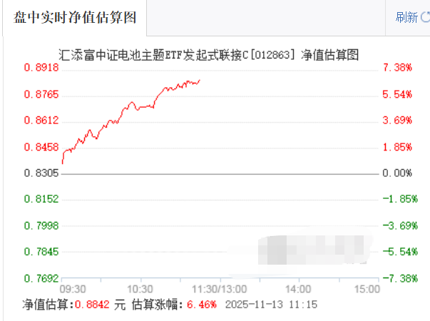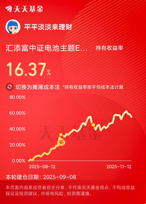 家人们什么情况呀~本来还准备四季度空仓的,结果我看$汇添富中证电池主题ETF发起式联接C(OTCFUND|012863)$目前估值收涨6。46%,我感觉现如今资金高低切换电池赛道是不是成为后续主线了呢?我准备趁着这一波行情继续加仓咯~