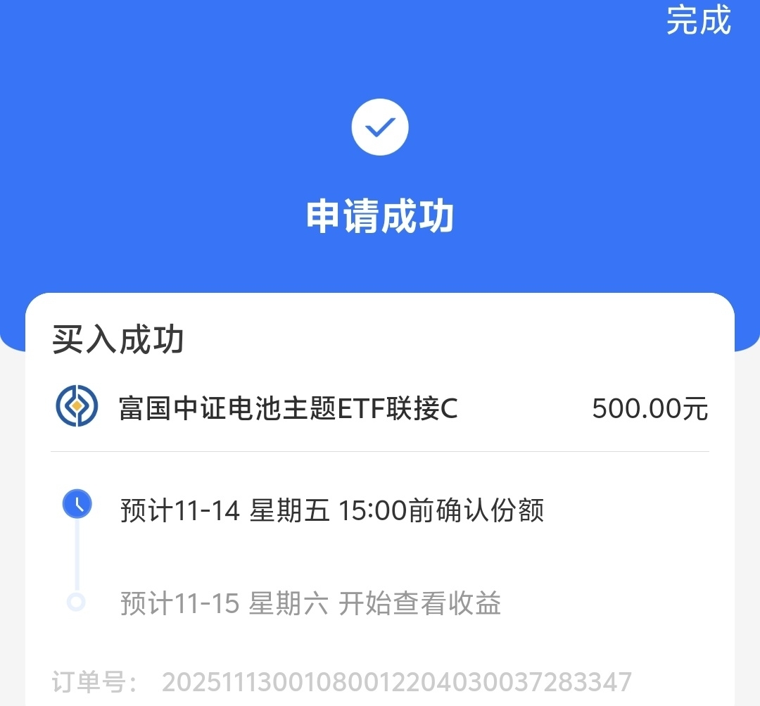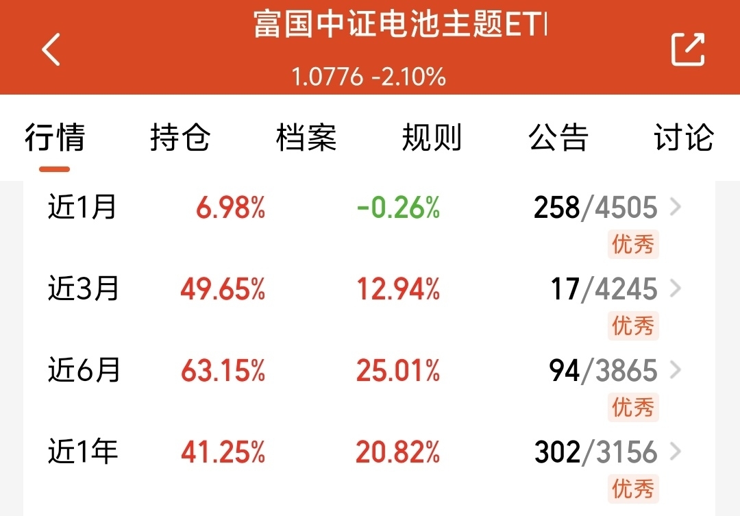 今天市场行情振作起来了,很多板块都表现不错,电池板块表现最为突出,估值超6%。当下新能源汽车旺季需求放量、储能市场量价齐升,固态电池技术突破加速,电池板块景气度持续走高,我打算入手我看好的$富国中证电池主题ETF发起式联接C$ 。