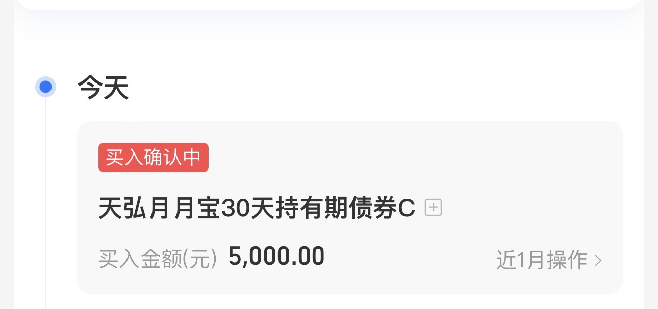 $天弘月月宝30天持有期债券C$ :小王今日上车5000元,这是一只稳健的纯债基金,目前成立以来未满一年收益率就已达到2.18%,而其最大回撤只有0.10%,这样优秀的回撤以及收益,我觉得值得我为它继续上车,我目前已经把这基金当作我的底仓基金,底仓基金我觉得一定要稳,这样才方便于我去进攻收益,所以我看中这个基金的稳定性;从最新的第四季度持仓来看,债券持仓占比119.73%,持仓以金融债与短融合计占比近73%,AAA级主体覆盖率高,这也是该基金偏于稳健的一个原因,并且赵鼎龙基金经理又是金牛基金经理,年华回报已经达到了2.88%,基金经理擅长聚焦宏观市场波动,均衡配置长短债资产,所以综合考虑我今日准备上车5000