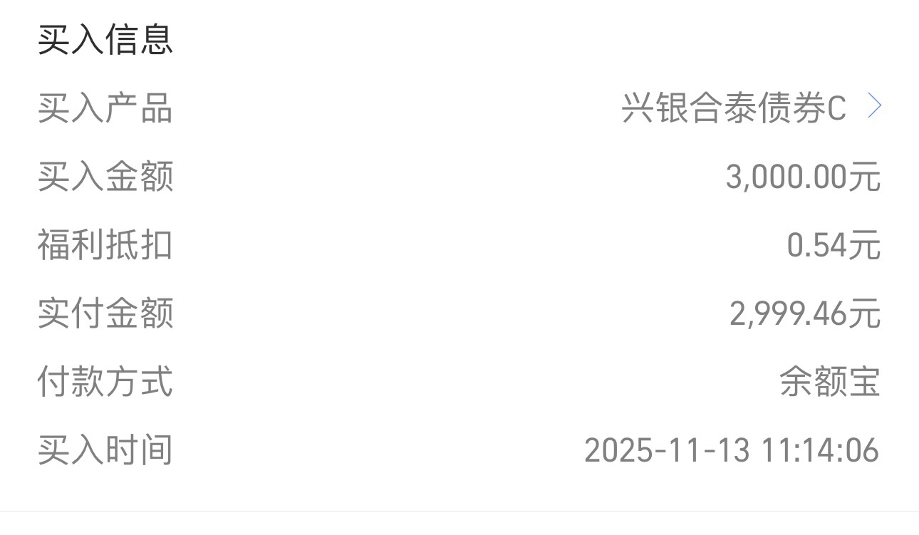 $兴银合泰债券C$ :小王今日红包3000-0.75上车,我最近还是非常看好这个基金的,因为这个基金回撤小收益又好,并且回撤修复能力还强,所以这样的基金我当然要选择继续上车,目前也已经成为我的重仓之一了;从最新的第三季度持仓来看,这是一只中长债基金,该基金主要配置金融债与短期融资债,通过杠杆策略增强收益,并且基金经理擅长短久期信用债挖掘,所以目前这个基金的业绩也是十分优秀,拉开长期收益来看:近一年的收益率达到3.48%,而其最大回撤只有0.83%,收益回撤比控制得还是十分到位的,再加上目前债市的行情正处于往上涨的时候,所以我只准备继续适应行情上车3000