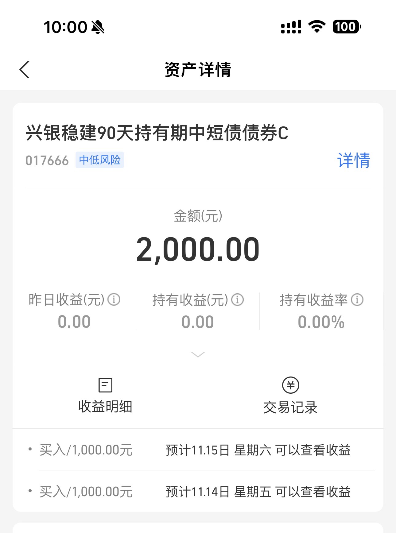 $兴银稳建90天持有期中短债C$ :我目前已经开启每天定投上车1000模式,我觉得该基金作为一个底仓基金还是十分合适的,昨天又是稳稳地收了两个蛋,也是属于涨得多碎得少的基金类型,我觉得这样稳健的中短债基金在我持仓里还是必不可少的,因为我还是要主打一个稳健理财,稳件也是我一贯的风格,我也看中这个基金的潜力;从最新的第三季度持仓来看,信用债占比116.11%,利率债占比4.57%,两者持仓相辅相成,也比较容易实现风险的对冲,并且拉开长期收益来看,近一年的收益率已经达到了3.05%,妥妥的跑赢了银行定期一年存款的三倍多,而且又多了一份灵活性,综合考虑,我觉得这个基金的性价比还是比较高的,所以我准备继续定投上车1000