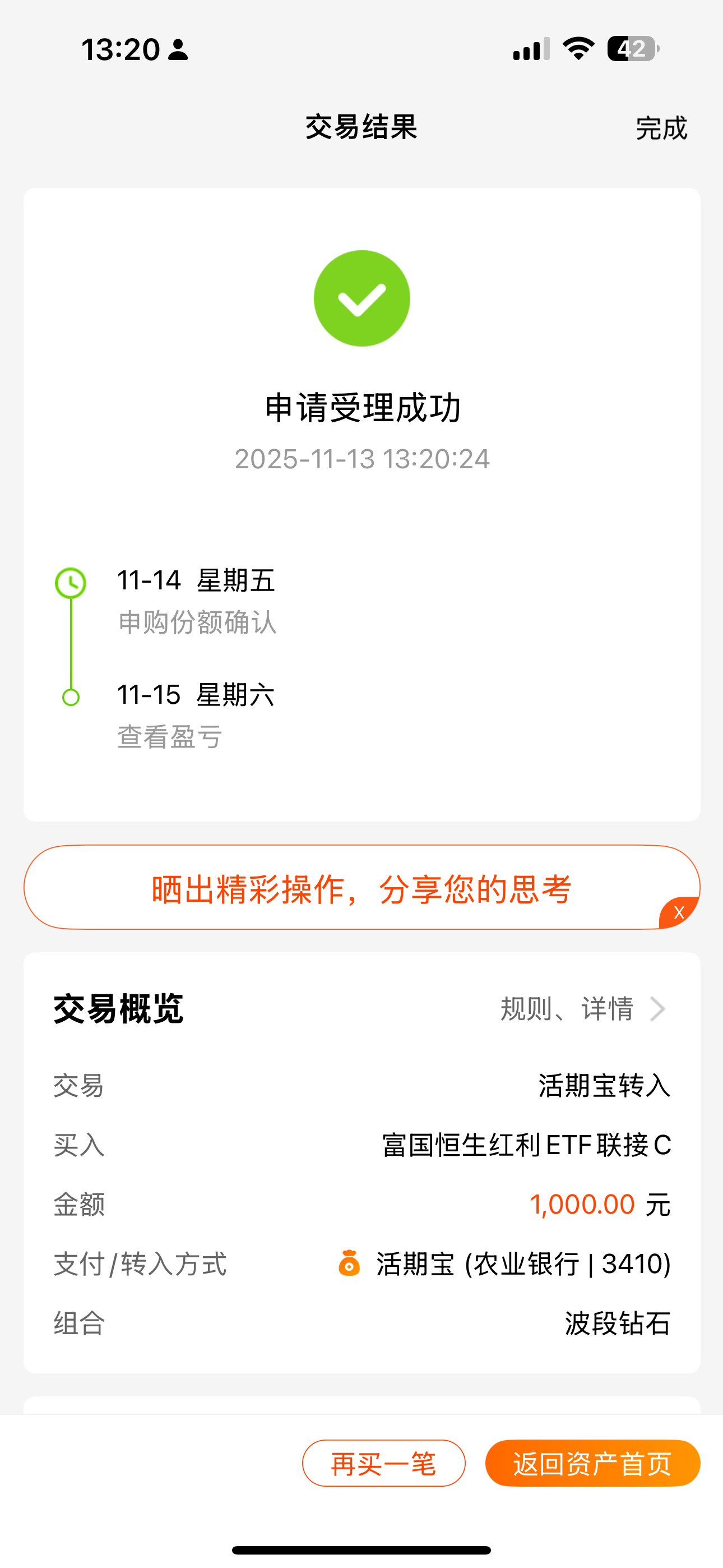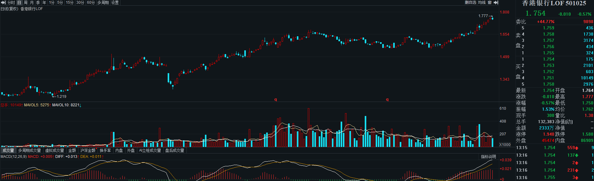 操作:低吸上车1000元$富国恒生红利ETF联接C(OTCFUND|019261)$基金,今日A股集体回暖,但恒生红利指数却高位震荡,目前指数微微翻绿,我依然选择加红利,主要是因为目前技术面的恒生红利依然处于多头趋势当中,均线多头发散,附图MACD二次金叉向上,技术面上有望继续走强,所以珍惜今日回调的机会,继续低吸上车。