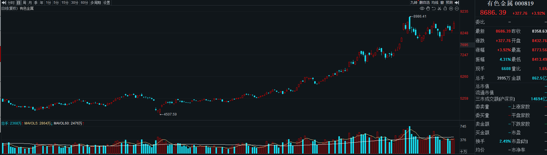 有色金属强势拉升,指数涨幅近5%,一根大阳线把趋势拉回来了,当下可以继续格局,短期有望再创年内新高。