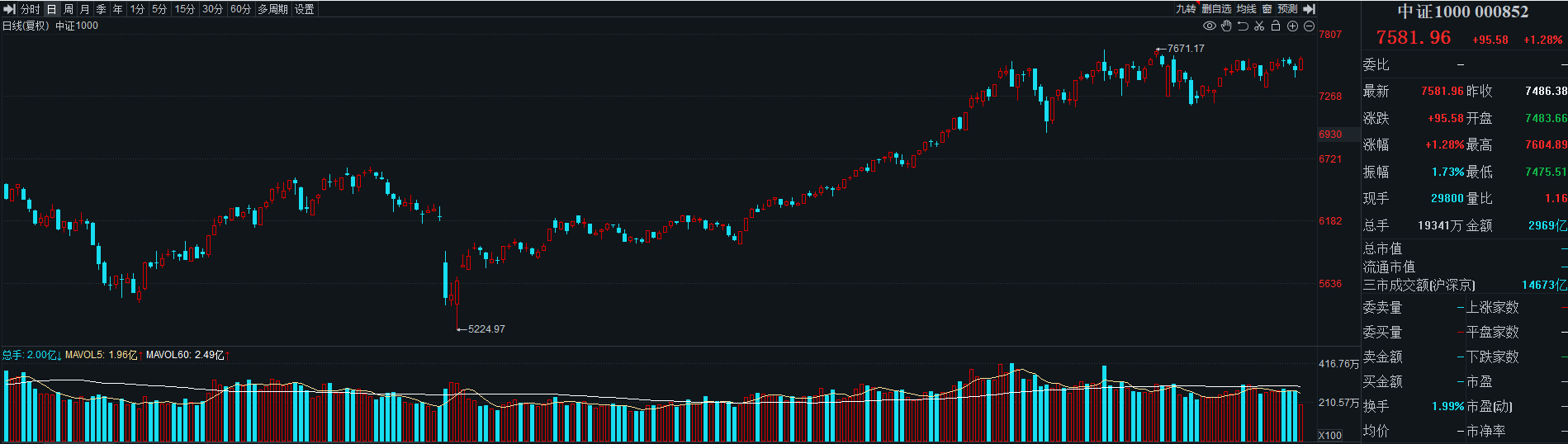中证1000指数震荡走强,指数涨超1%,技术面上近期都在震荡,这次A股止跌回暖,中证1000有机会突破箱体,有望继续走强。