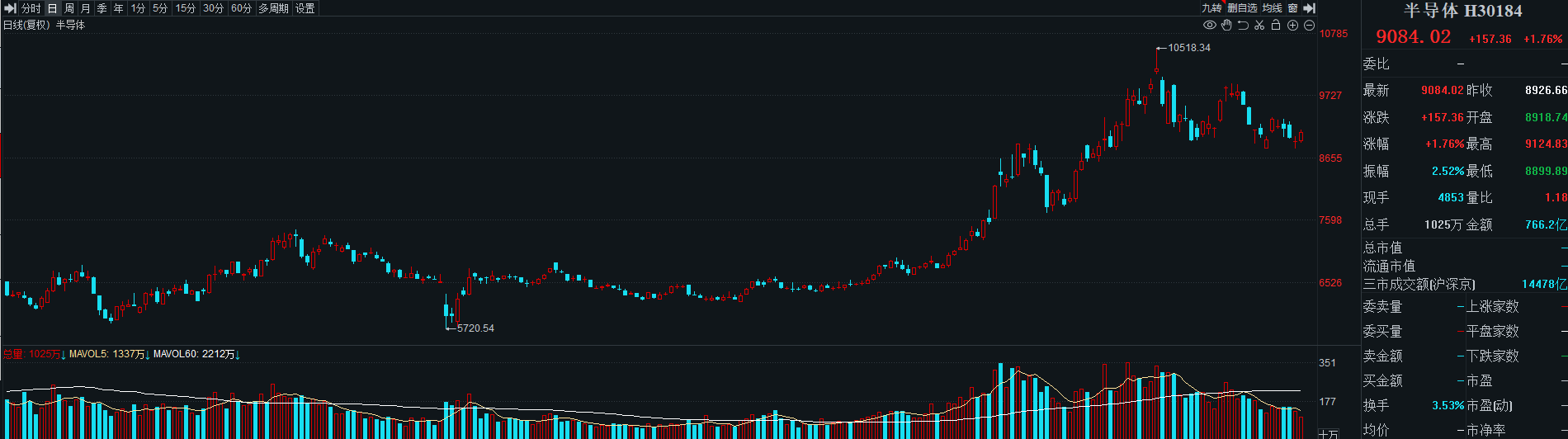 昨日半导体在60日均线附近探底回升,今日半导体震荡走强,指数涨幅近2%,附图MACD的绿色能量住缩量,短期行情有望继续走强,关注20日均线的压力,等待突破以后,再去顺势找机会做加法。