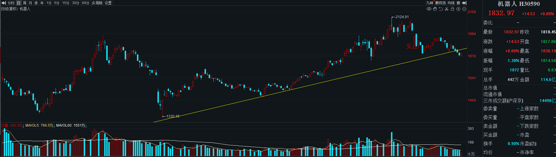机器人震荡走强,指数涨幅近1%,日k线反弹到5日均线附近,关注5日均线,只有价格重新站上5日均线,机器人的多头趋势才会确立,当下继续躺平等待。