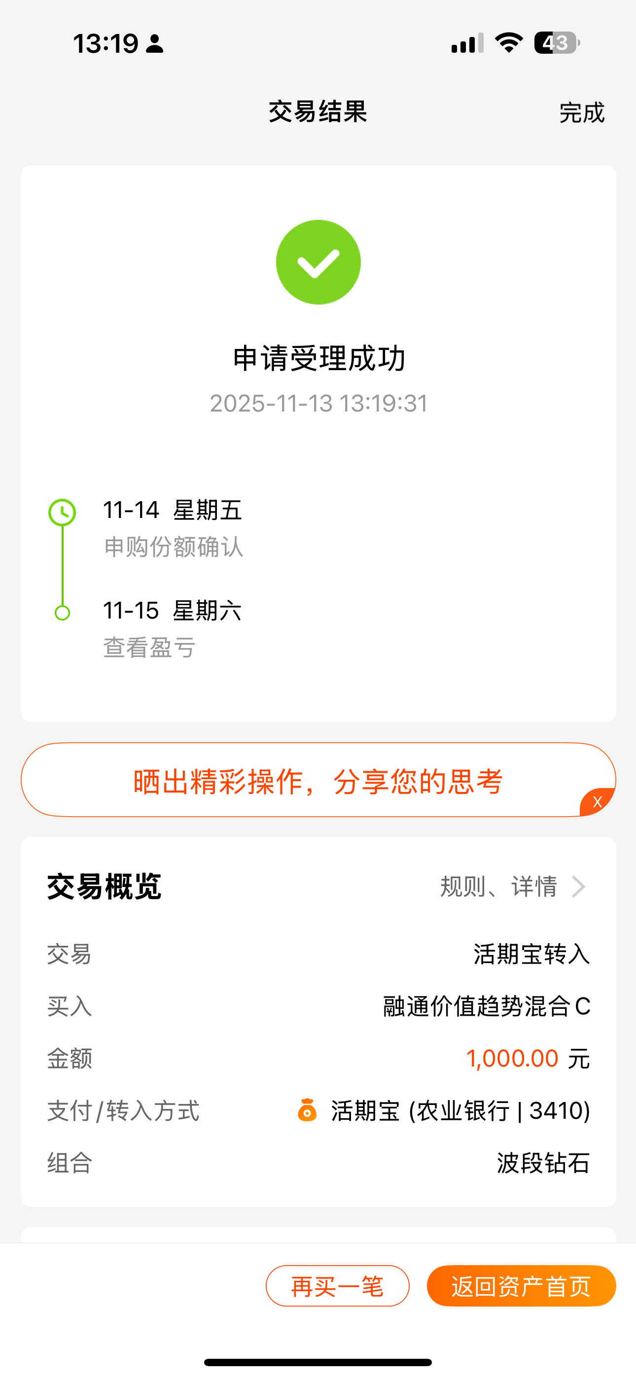 操作:低吸上车1000元$融通价值趋势混合C(OTCFUND|010647)$基金,这是我最近挖到的一只硬核科技基,简直就是AI算力+港股互联网+储能三合一王牌组合,在今年轮动的A股市场里面非常吃香,尽管10月中旬以来A股市场出现了调整,但该基金今年以来的收益依然高达87.13%,远远超过同类平均31.86%,超额收益直接翻倍,这主要都是基金经理李进的功劳啊,他直接All in科技赛道,前十大重仓股全是行业扛把子,比如新易盛、中际旭创,这俩直接吃透AI算力基建红利,光模块出货量今年翻倍涨,所以李进的平均年化收益可以做到32.81%,太让我惊喜了!