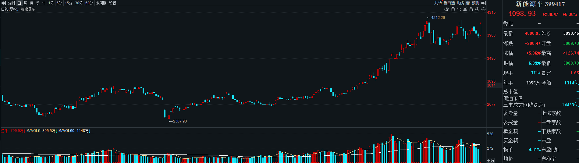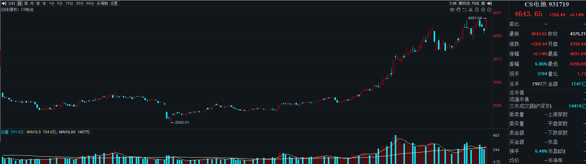 A股集体大涨!创业板涨超2%,盘面上,电池相关板块早盘集体冲高,电池板块的集体大爆发是受多方面因素催化。首先是上游原材料的持续涨价,其次是新能源行业也接连迎来政策利好,最后是锂电供应协议密集落地,行业巨头频频“锁单”。大盘前期在4000点附近反复洗盘,释放了大量的市场风险,今日一根大阳线直接拉升,把市场情绪直接点燃了,今日是顺势布局的好机会啊!