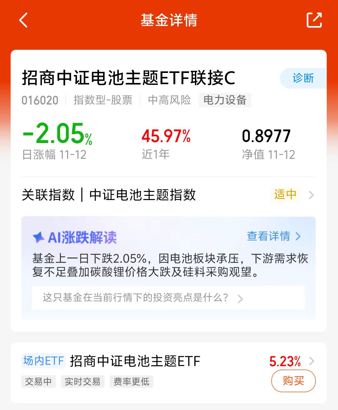 大盘今天太给力了,电池板块今天大涨,$招商中证电池主题ETF联接C(OTCFUND|016020)$目前预估涨幅5.23%,不过从一年维度来看,锂电池板块目前估值还不是很高,后续仍有向上空间,固态电池落地加剧也有望提升板块估值,看好这个方向,我准备分批加仓了!