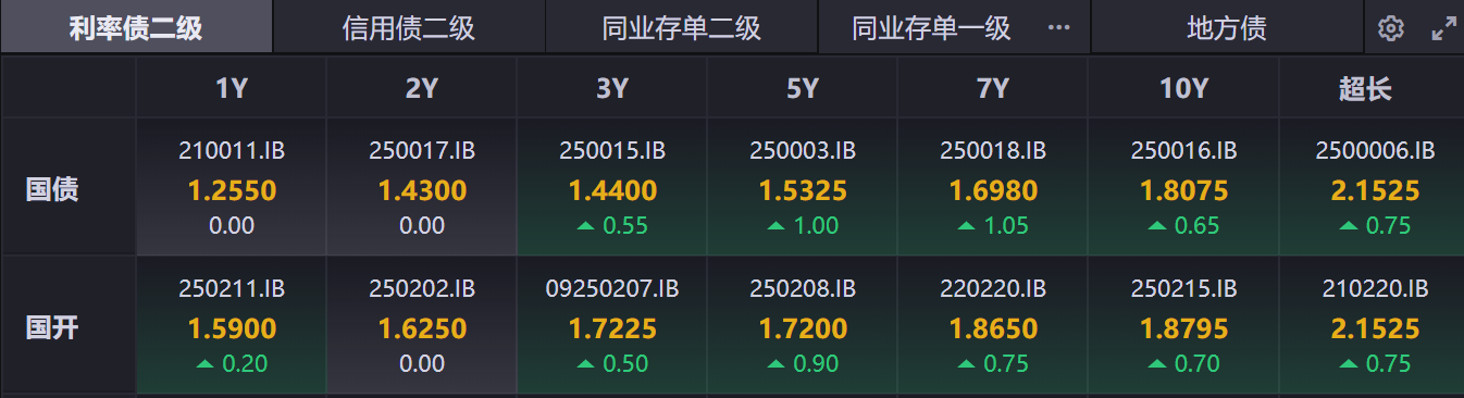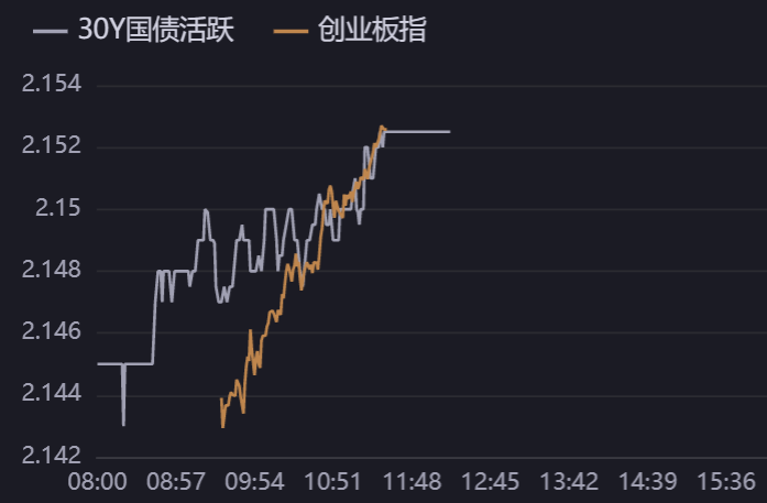 答:上午,股市的部分板块非常强势,包括电力设备、有色、化工等,带动创业板涨超2%,债市明显跟着股市走,长债收益率上行,但依然是1bp内的窄幅行情——从10月29日以来,这已经是连续第12个交易日,10年国债的日度涨跌,不超过1bp。