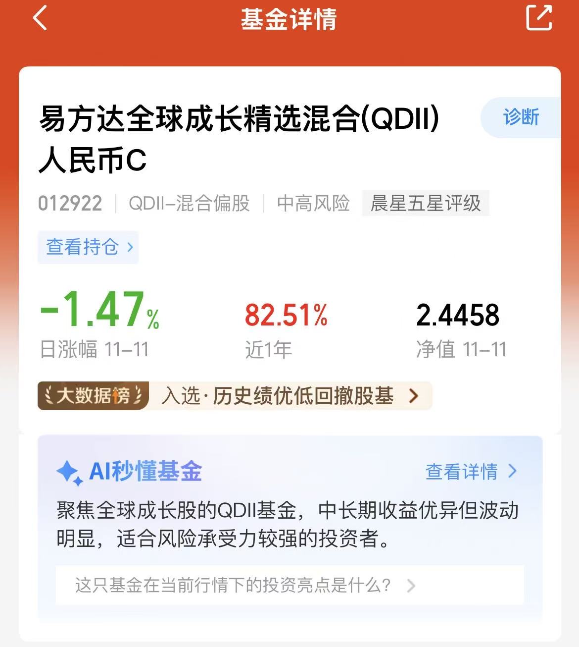 最近A股市场表现不给力呀,连续回调,板块轮动也快,还好今天迎来反弹了,美股市场昨夜涨跌不一,我更喜欢面向全球市场,我持仓的$易方达全球成长精选混合(QDII)人民币C(OTCFUND|012922)$是投资多地市场科技成长方向的,有A股美股和港股,经理管理的也强,我目前收益也不错呢,继续持仓待涨了。#多重利好催化!新能源走强# #黄金又牛起来了!这次你上车了吗?# #多重利好催化!新能源走强#