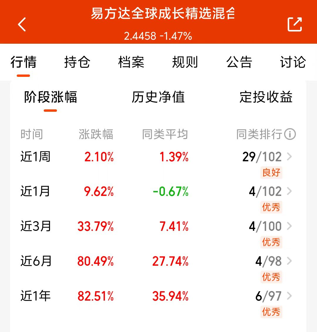 大A今天太给力了吧,三大指数整体涨了不少,沪指持续拉升,又创了十年新高!美股昨夜回调了,近期市场轮动很快,单一市场风险还是挺大的,易方达全球成长精选混合C持仓有美股、港股和A股科技板块,经络调仓能力不错,还是历史绩优低回撤榜一,回撤也控制的不错,我准备分批入手了!