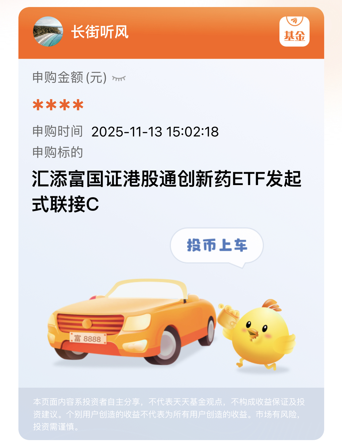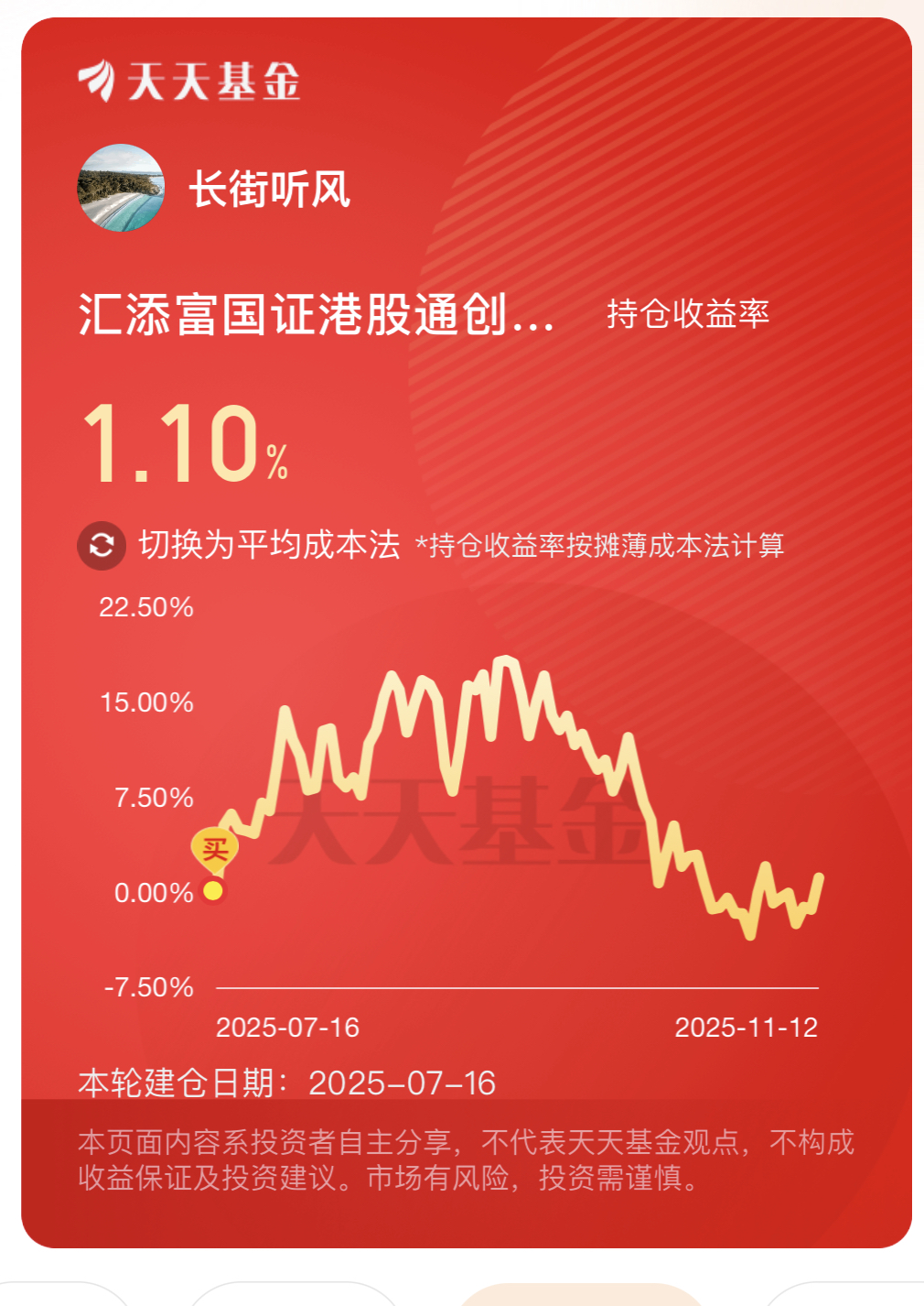 流感季来袭,创新药再次成为市场热点,我手里的$汇添富国证港股通创新药ETF发起式联接C(OTCFUND|021031)$也迎来强势表现,昨天上涨2.52%,今天估值又涨了4.05%,今天果断继续定投加仓!