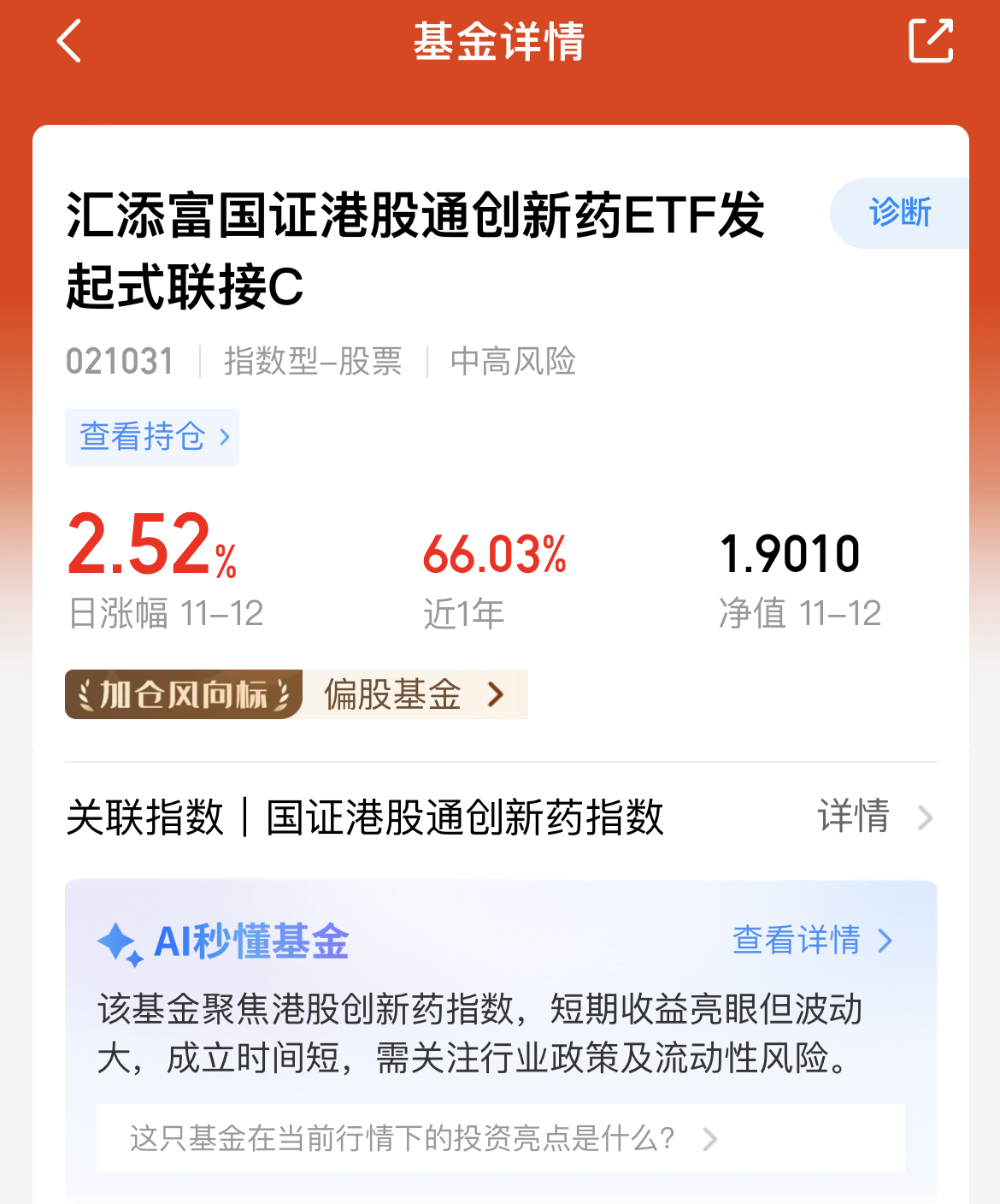 这只基金最让我青睐的是“100%纯赛道”属性,专注港股通创新药及医疗保健领域,聚焦百济神州、信达生物等龙头企业,没有杂项持仓,板块弹性远超混合型基金,能精准捕捉行业红利。而且它的费率特别低,长期持有能有效降低成本,复利效应更明显。