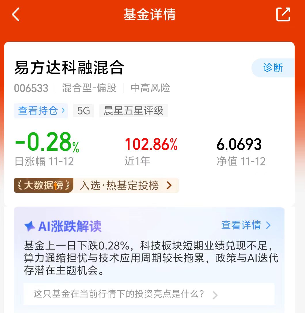 大盘今天太给力了吧,三大指数持续拉升,新能源、科技等板块今天都涨了不少呢,近期市场波动加剧,各大板块轮动速度很快,易方达科融混合持仓有科技,还有新能源、军工等板块,经理轮动配置,调仓能力不错,近一年涨了102.86%,看好这个方向,我准备分批加仓了!