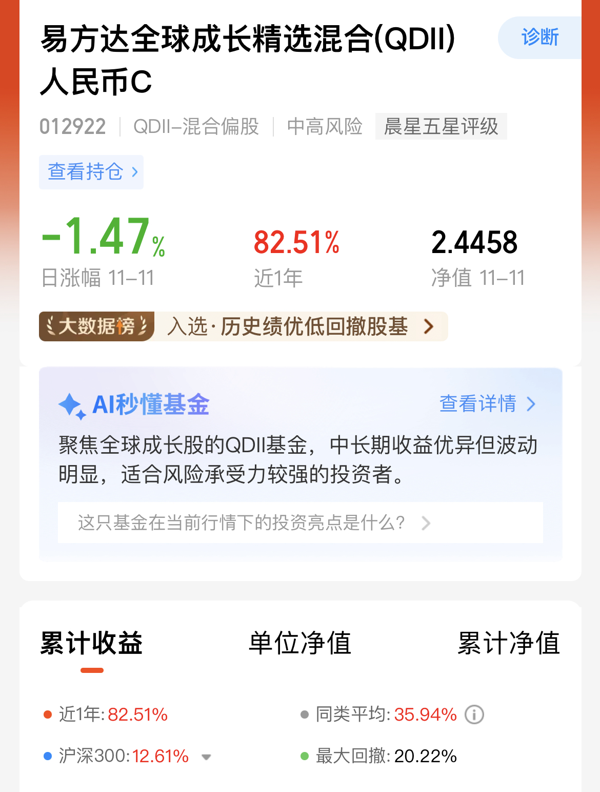 今日市场行情普遍上涨,大科技更是带来率先领涨行情,可见当前慢牛趋势不变,而当下科技长期行情乐观,无论是海内外都有很大机会,所以我准备上车一波:易方达全球成长精选混合C,投资策略以全球科技为主,精准把握多个市场的科技成长机遇,业绩方面更是出色,近三个月涨幅33.79%,近一年涨超82%,大幅度跑赢同类平均35.94%,各个阶段的业绩都排名优秀靠前,考虑到科技作为市场主线,仍然有着十足的上涨动力,我也准备慢慢定投起来了!
