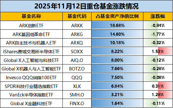 【重仓涨跌】根据基金2025年三季报披露,重仓基金中3只为“木头姐”凯茜伍德旗下聚焦于美股前沿科技的基金,合计占比达43.46%。