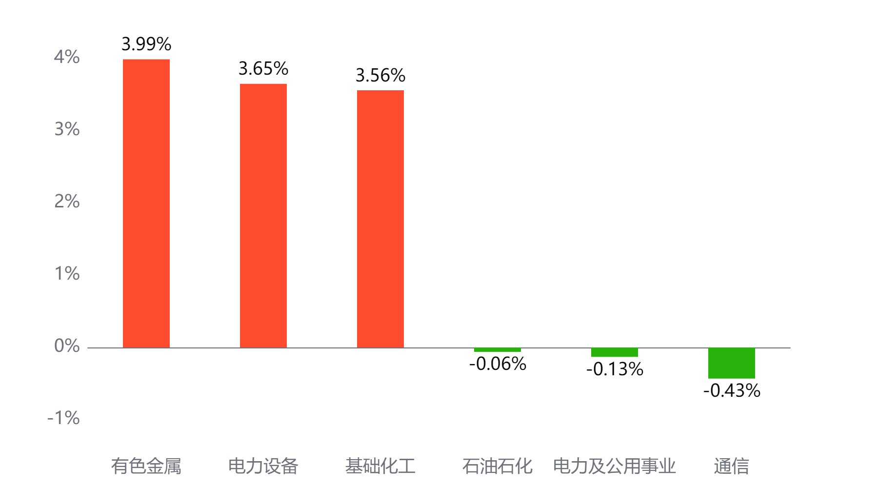今天表现最好的行业板块依次为有色金属、电力设备、基础化工,表现最差的依次为石油石化、电力及公用事业、通信。