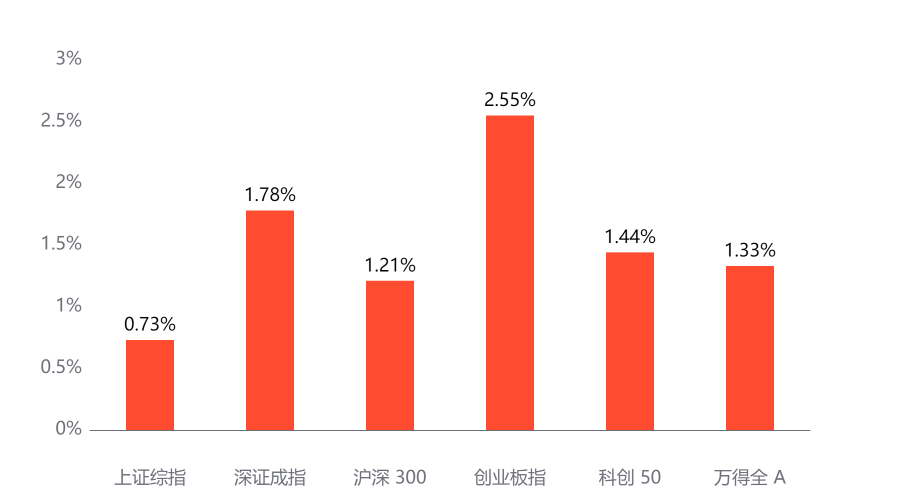 截至今日收盘,市场各主要指数普遍上涨。上证综指收4029.5点,上涨0.73%;深证成指收13476.52点,上涨1.78%;沪深300上涨1.21%,创业板指上涨2.55%,科创50上涨1.44%,万得全A上涨1.33%。