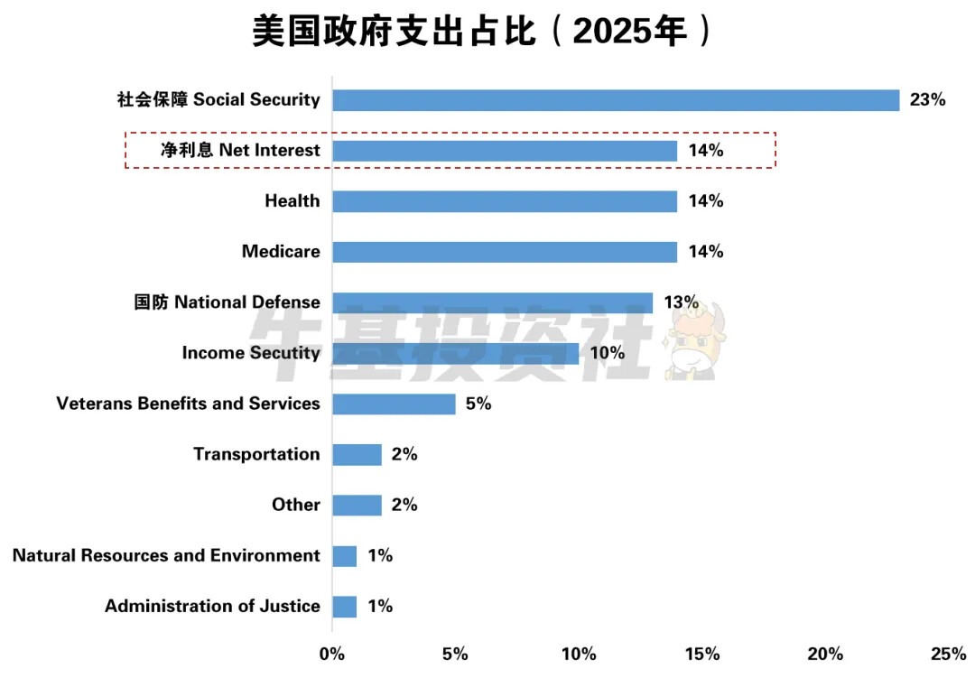更为严峻的是,欠这么多债,光利息就是一笔天文数字。2025年,美国光是支付国债利息就花掉了总财政支出的14%,这笔钱已经超过了国防开支,成为仅次于社会保障的政府第二大财政支出项。