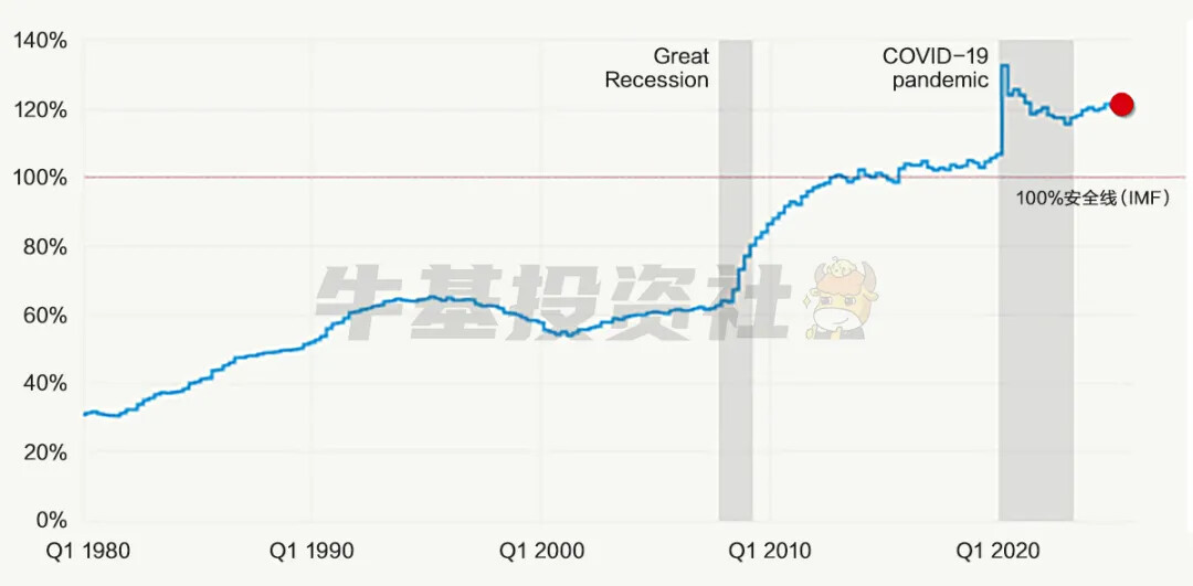 截至2025第二季度,美国债务占GDP的比重为119%,远超国际货币基金组织为发达国家设定的100%警戒线。