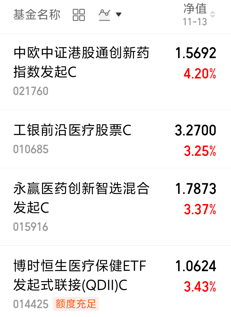 $中欧中证港股通创新药指数发起C(OTCFUND|021760)$今天涨了4.20%