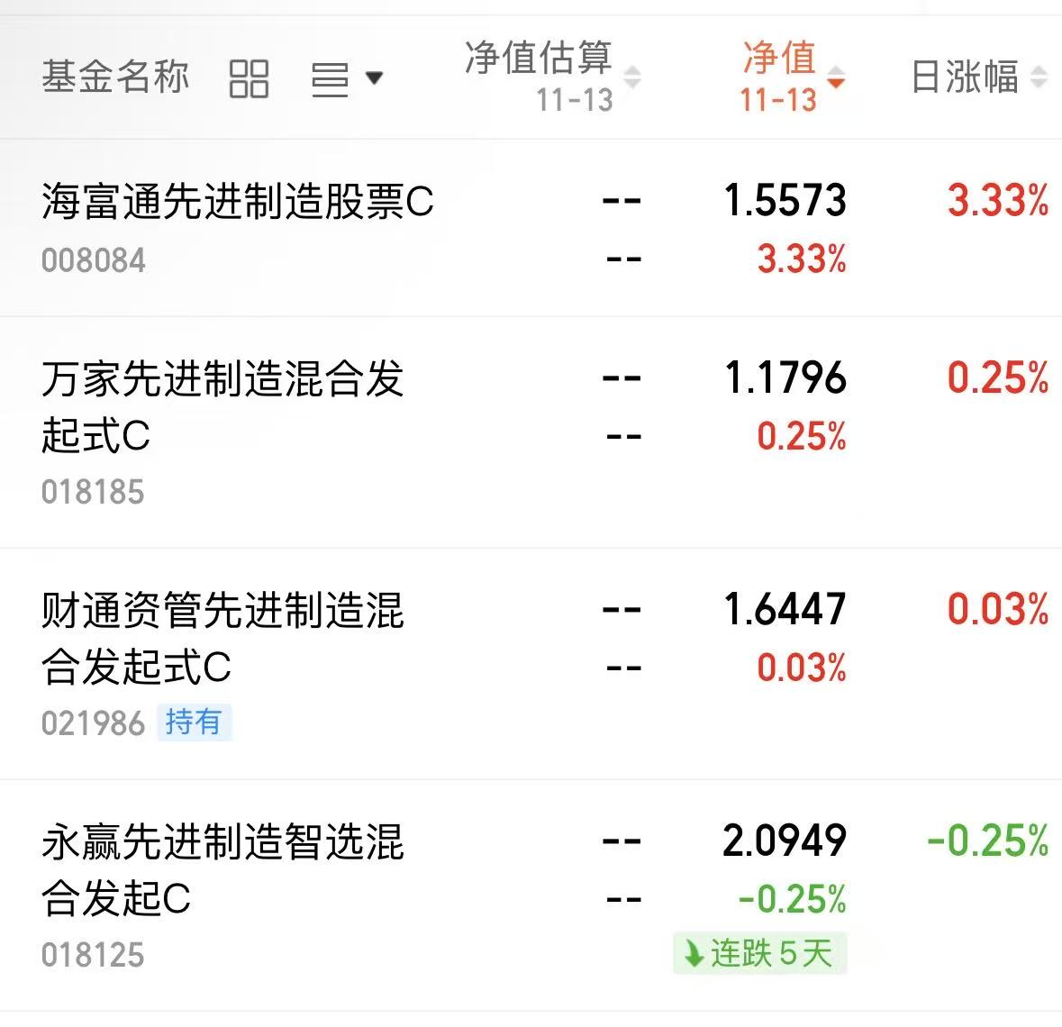 都是先进制造,但是净值更新不同,不同的基金侧重点是不同的。现在沪指虽然创了10年新高,但是我觉得还是个板块轮动的混沌状态,总会轮到的,稍安勿躁。