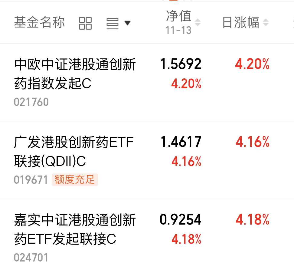 $广发港股创新药ETF联接(QDII)C(OTCFUND|019671)$今晚上涨4.16%