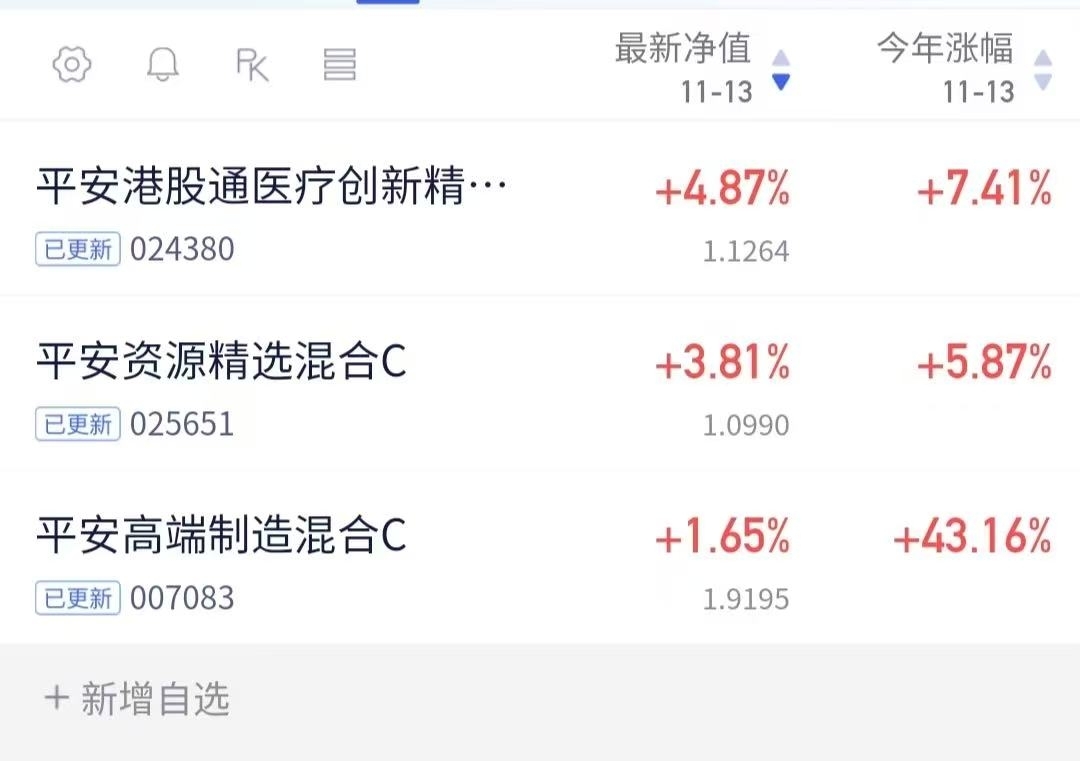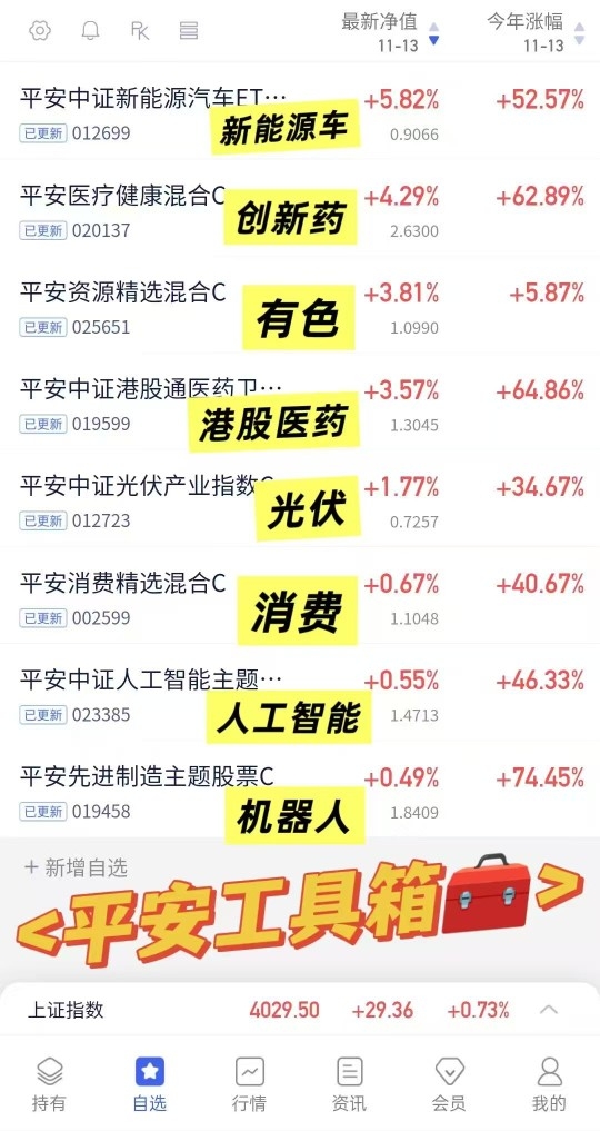 大盘今天再创近期历史新高,慢牛行情持续,但板块之间分化的很严重,这个时候均衡布局或更好的选择。今天平安全家桶全线大涨,尤其是资源精选连涨7天;平安高端制造布局光伏+新能车,最近16天只绿了3次,根本不给上车机会;平安港股通医药也表现很好,感觉年内第二波要开启了,或是布局好时机。$平安港股通医疗创新精选混合C$ $平安资源精选混合发起式C$ $平安高端制造混合C$