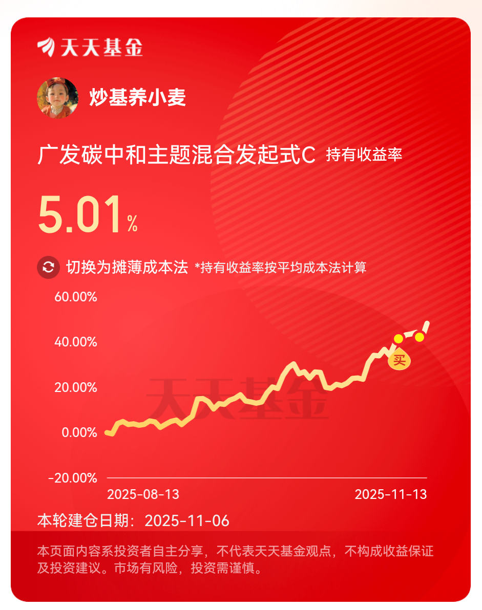 说到电池能源板块,麦爸不得不提一下昨天的操作,昨天麦爸加了$广发碳中和主题混合发起式A(OTCFUND|018418)$,今天就迎来4.85的大涨,妥妥的吃大肉了,继续看哈!有没有昨天跟着麦爸一起操作的小伙伴啊!
