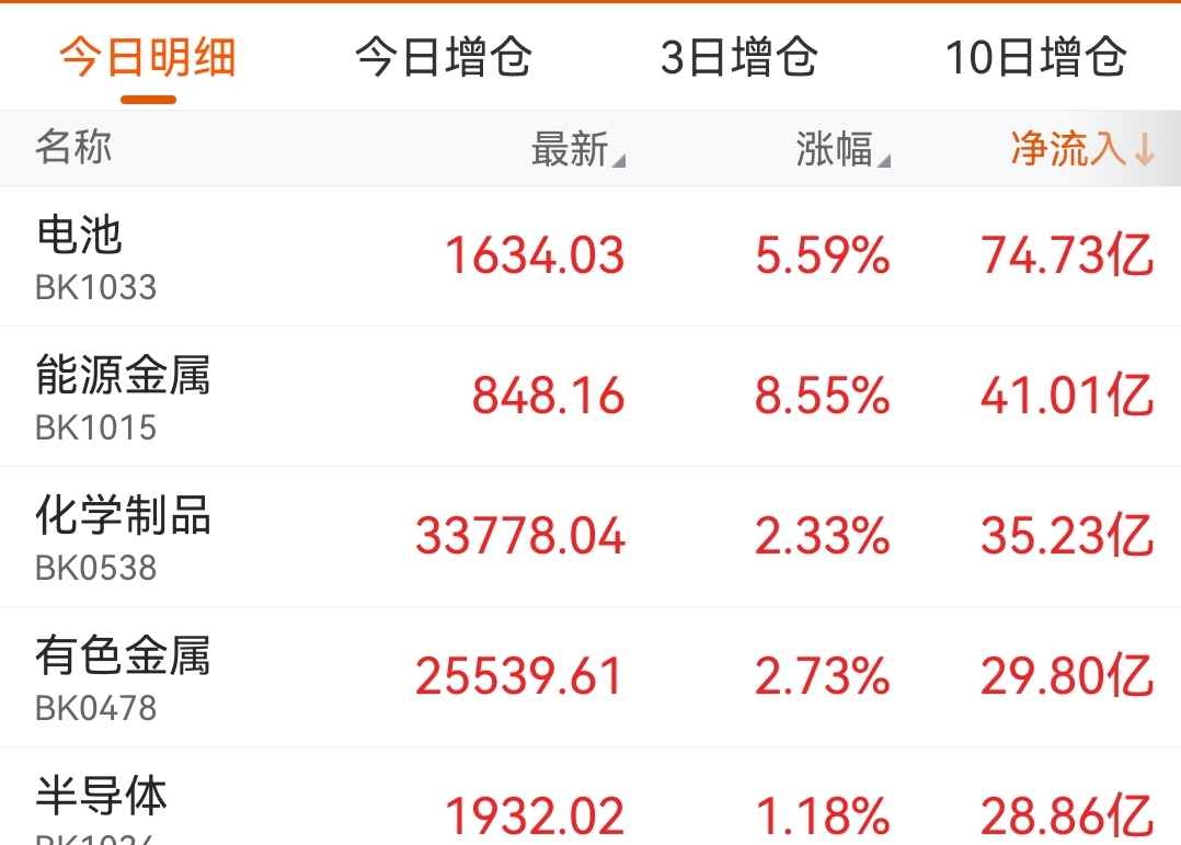 今天最靓的仔必须是电池板块!资金净流入74.73亿,妥妥的市场吸金王,板块内多股涨停,宁德时代涨超7%带头冲锋,简直是肉眼可见的强势。