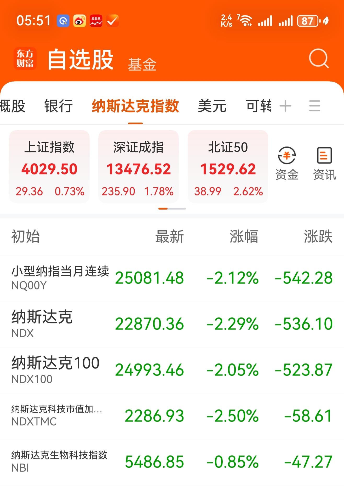 在今天早上,观察美股纳斯达克指数、美股纳斯达克100指数,在后半夜继续陆续跳水变大跌-2.05%了。