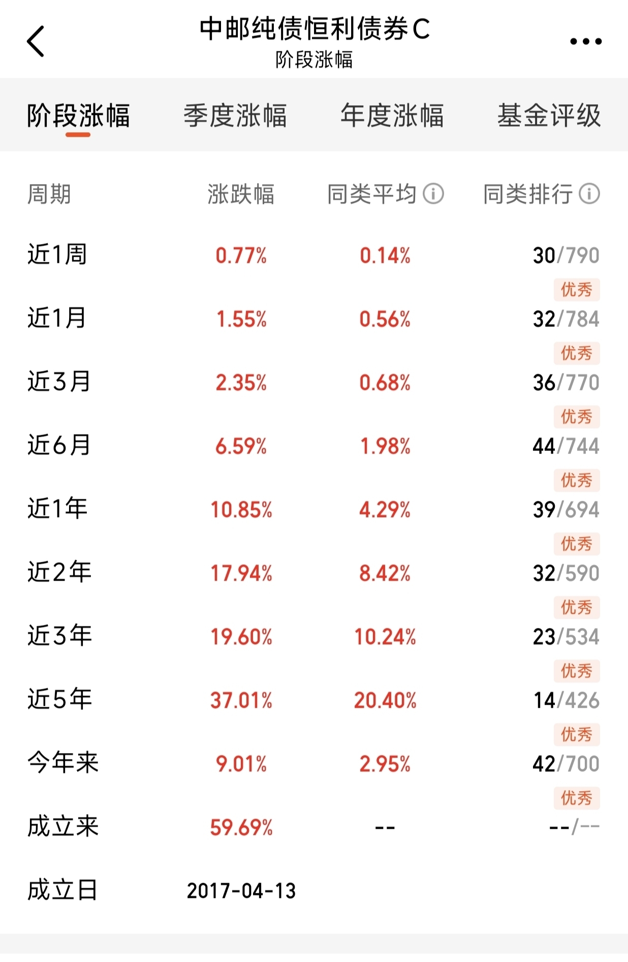 我在#黄金又牛起来了!这次你上车了吗?# 选择了“绝不参与” 我感觉自己还是配置混债更好一些,这个$中邮纯债恒利债券C$ 主投可转债和纯债,没有股票,低费率,昨天42个蛋