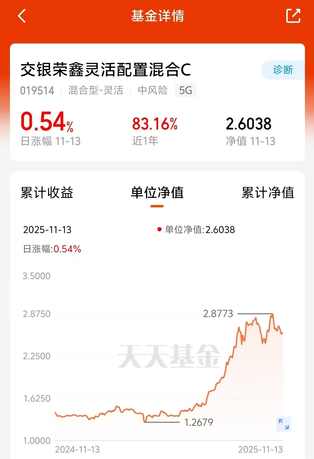 交银荣鑫灵活配置C近1年涨83.16%、近6月85.83%,把沪深300按得死死的。今天还涨0.54%,净值也往上走。它是灵活配置,不用死扛单一板块,能跟着核心赛道走,现在行业后续还有不少催化,只要基金经理能跟上市场节奏,这业绩后续应该能继续保持不错的涨势。