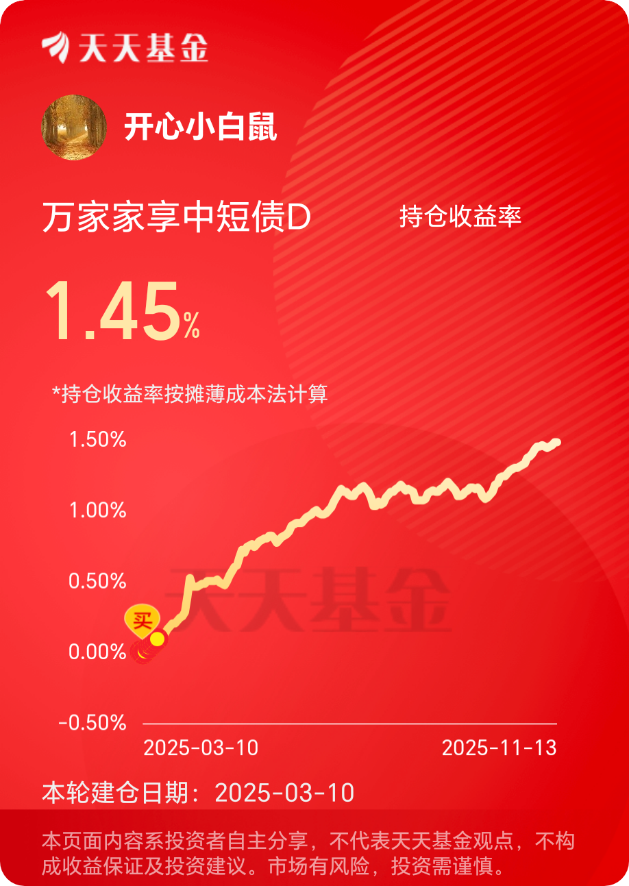 #黄金又牛起来了!这次你上车了吗?# 利率债行情震荡下行,还好持有的万家家享没有碎蛋,而且稳健,长期配置确实不错#晒收益#