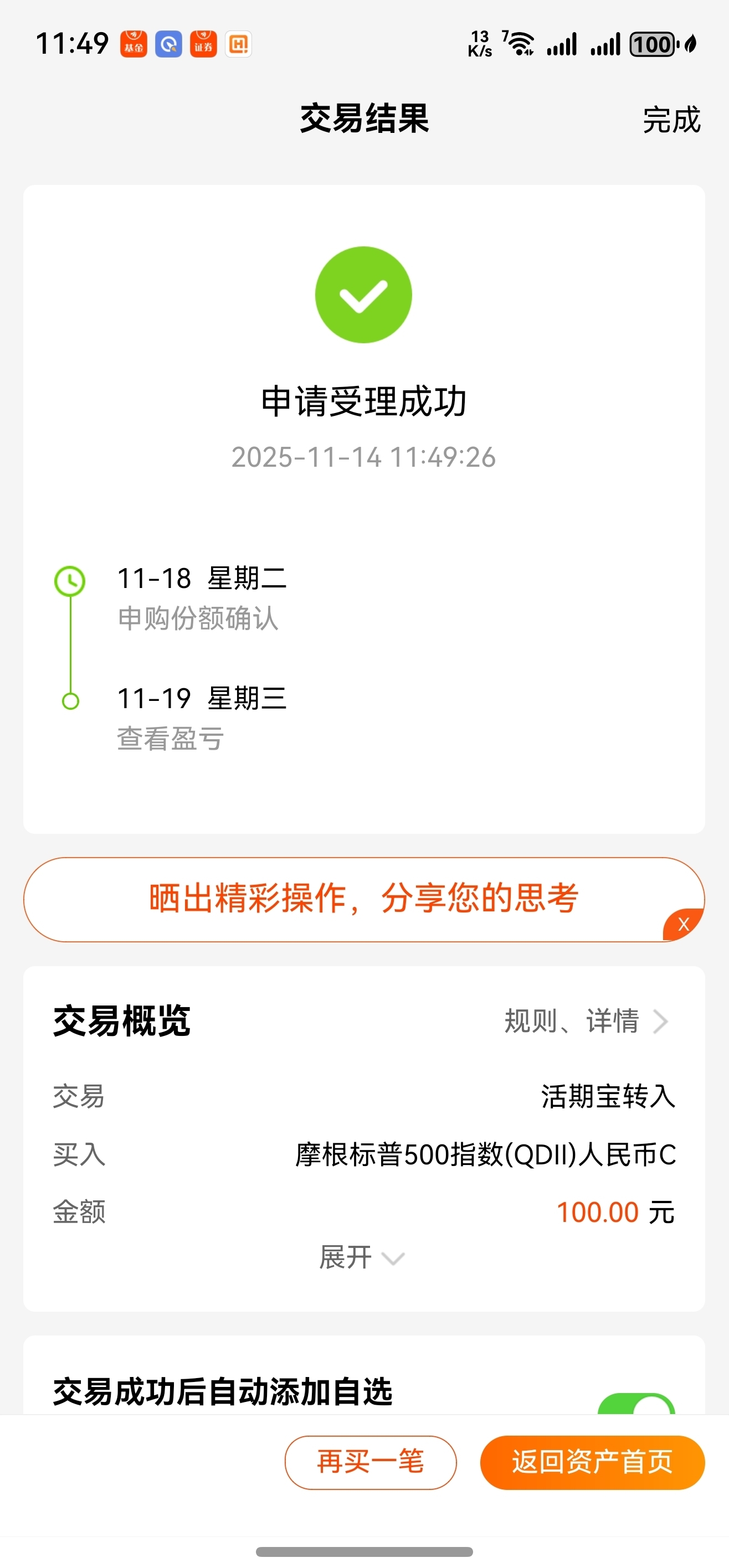 在今天,继续考虑选择加仓某个标普500指数qdll基金,在每天加仓买100元操作
