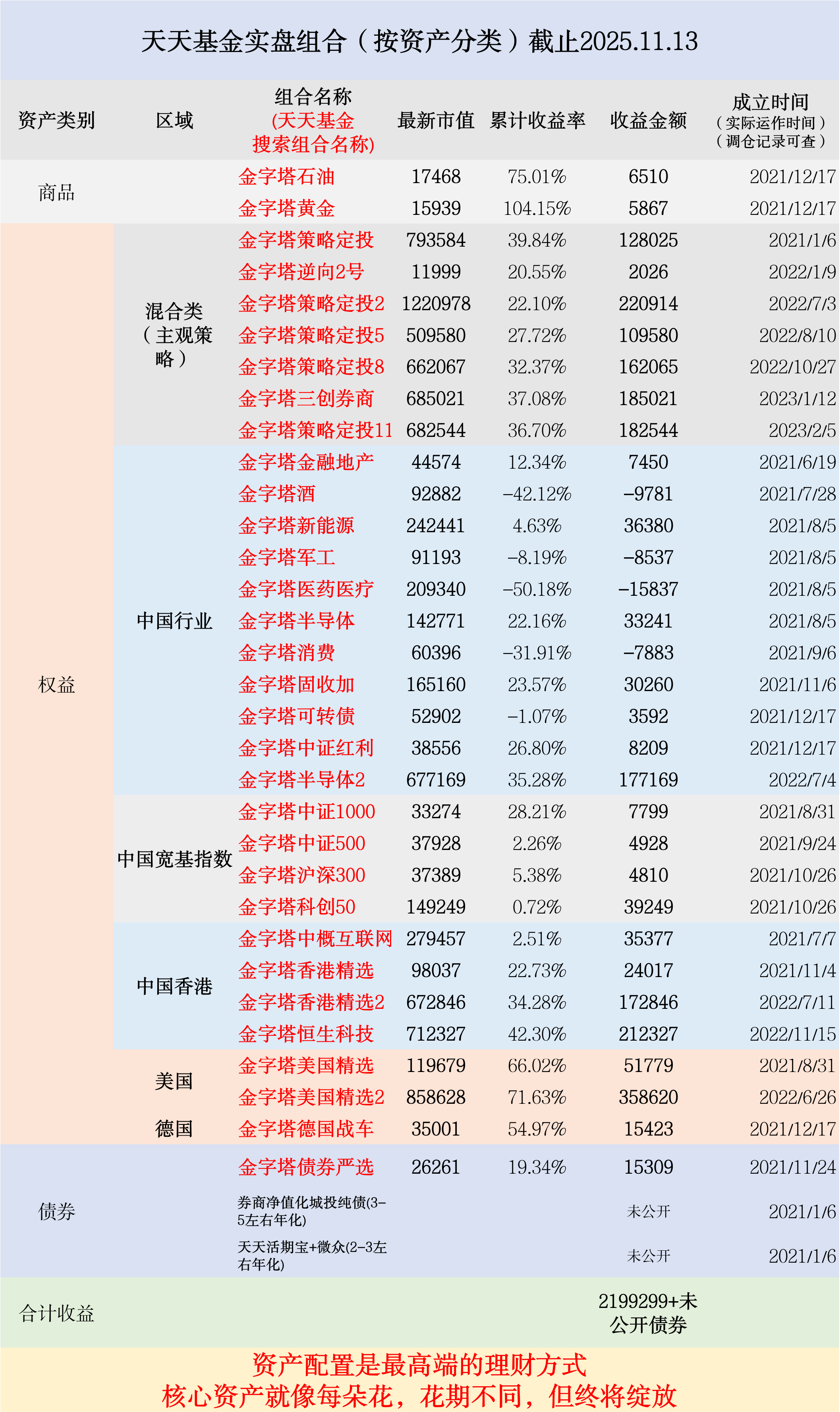 目前累计收益2199299+未公开债券收益,累计收益率排名前三的组合分别是黄金、石油、美国精选2;排名后三位的是医药、白酒、消费。收益金额排名前三的是美国精选2、恒生科技、策略定投2;排名后三的是医药、消费、白酒。