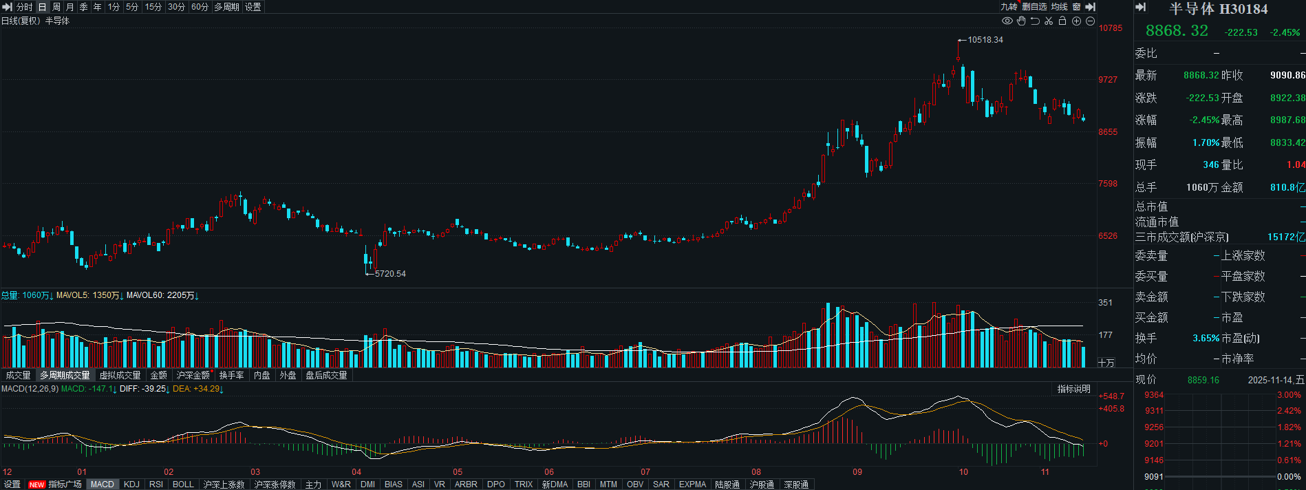 半导体在60日均线附近继续震荡,指数超跌2%,日内继续关注60日均线的支撑,这个支撑必须要稳住,否则短期还有下跌的风险。